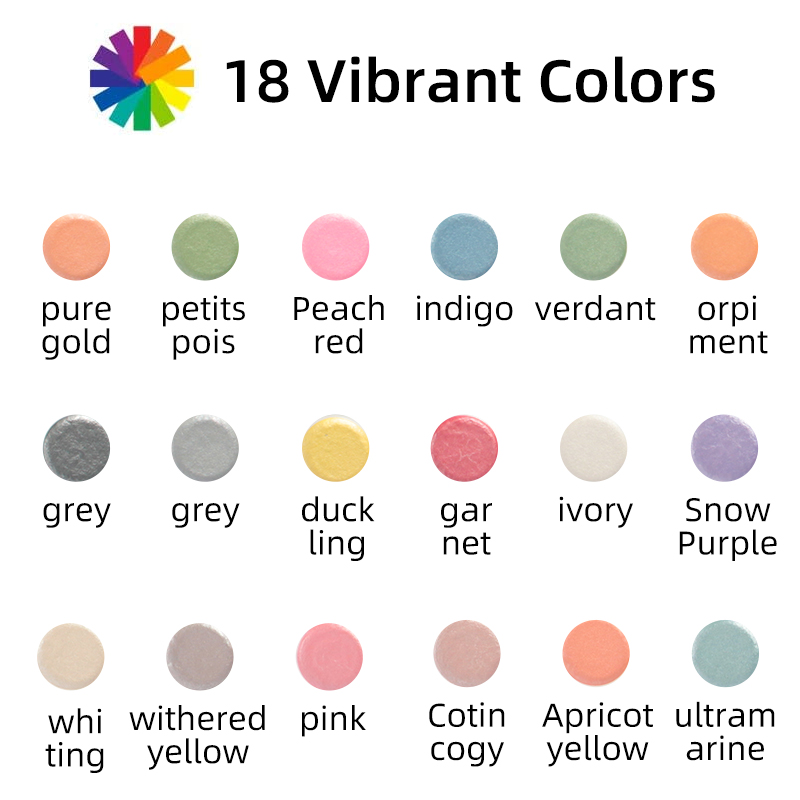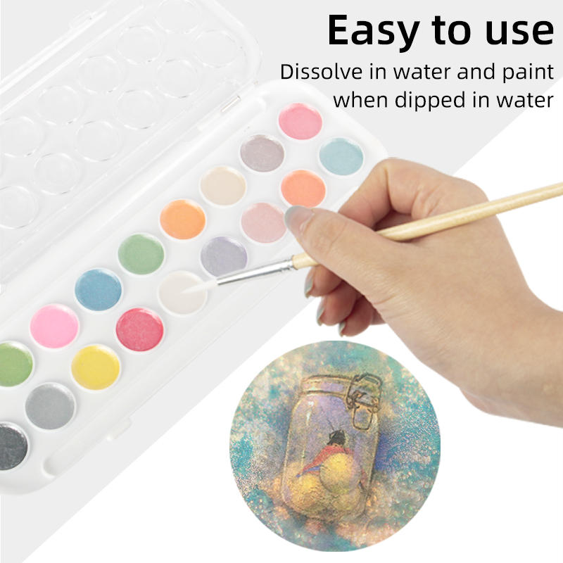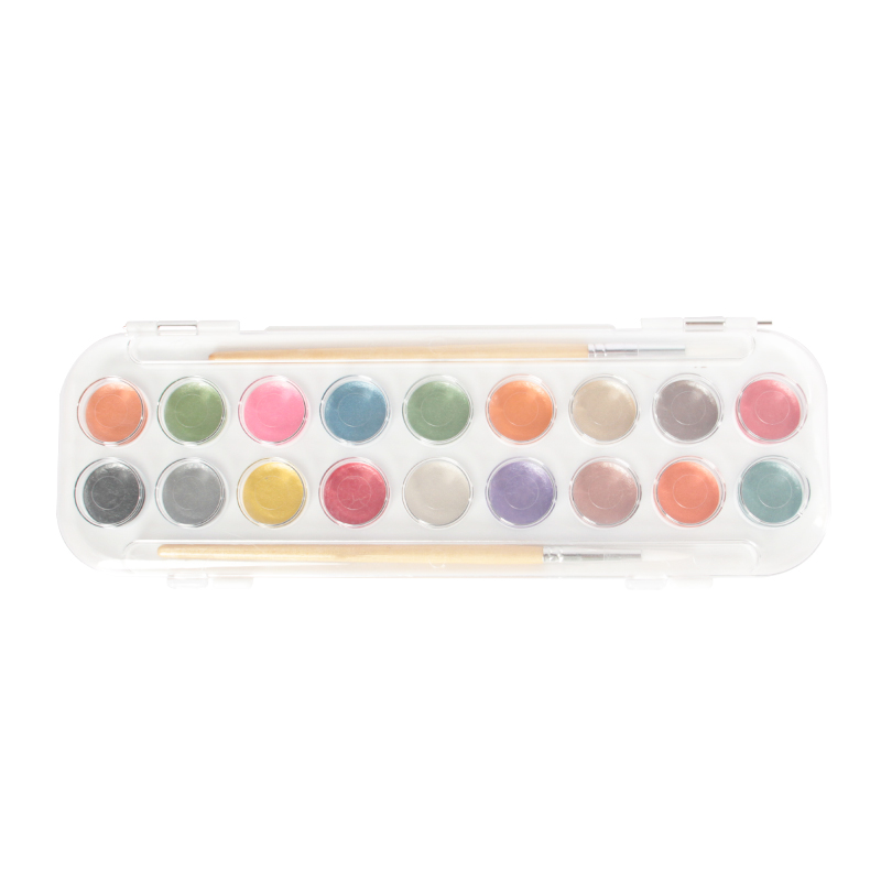 Naša továreň sa pýši výrobou vysokokvalitných 18 akvarelov s kovovými farbami. Séria trblietavých akvarelových metalických farieb sa môže pochváliť 28 extra jemnými, čistými pigmentmi známymi pre svoju vynikajúcu transparentnosť, difúziu, svetlostálosť a sýtosť. Vďaka tomu sú ideálne na bezproblémové miešanie a miešanie v umeleckých snahách.